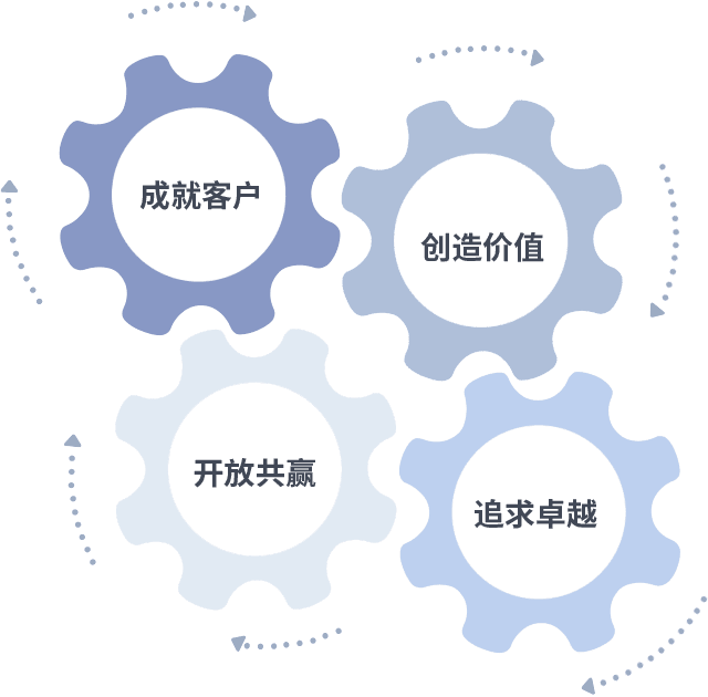 成就客户是一切决策的出发点,,,创造价值是衡量所有工作的标准,,,追求卓越是我们做事做人的态度,,开放共赢是我们的格局也是最终的结果。。。。价值观的齿轮环环相扣,,,,推动着组织里的每个人不断向前。。。